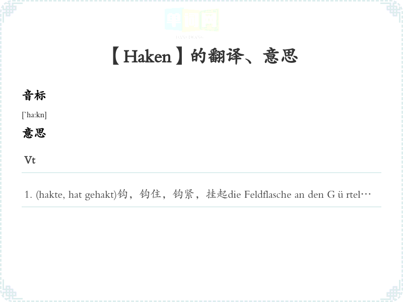 (hakte, hat gehakt)钩,钩住,钩紧,挂起die Feldflasche an den Gürtel haken 把行军水壶挂在腰带Vi(口)钩住,攀牢,挂着Der Schlüssel hakt im Schloß. 钥匙卡在锁眼里了。语法搭配+四格, in+四格, an+四格