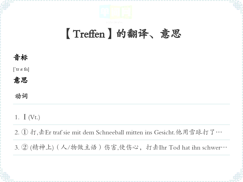 ⑤ <与某些名词连用时,意义等于与此名词相应的动词>与某些名词连用时,意义等于与此名词相应的动词>Ⅱ(Vi.)经受到,遭到,遇到Ⅲ(Vi.)(s)(偶然)碰见,遇见,碰上Wie es sich so trifft!这真是巧遇!真巧!Ⅳ(refl.)