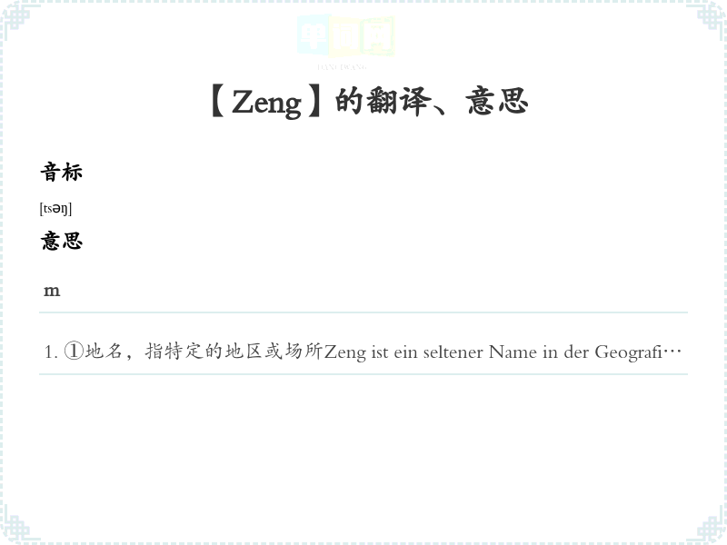 ①地名,指特定的地区或场所Zeng ist ein seltener Name in der Geografie.鄫是地理中的一个少见名称。