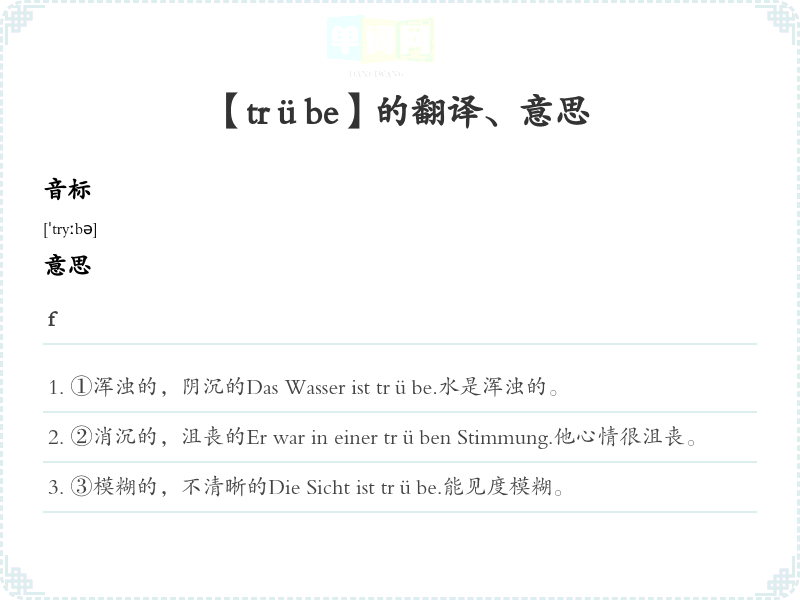 1.Trübe浑浊;Trübsal忧伤;Trüben浑浊的;Trübung浑浊;