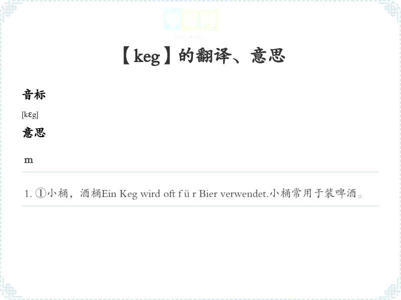 ①小桶,酒桶Ein Keg wird oft für Bier verwendet.小桶常用于装啤酒。