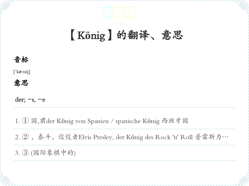 ② ,泰斗,佼佼者Elvis Presley, der König des Rock 'n' Roll 普雷斯力,摇滚乐泰斗Dieser Wein ist der König der Weine.这种葡萄酒酒中之。Hier ist der Kunde König. 这里顾客最重要的。