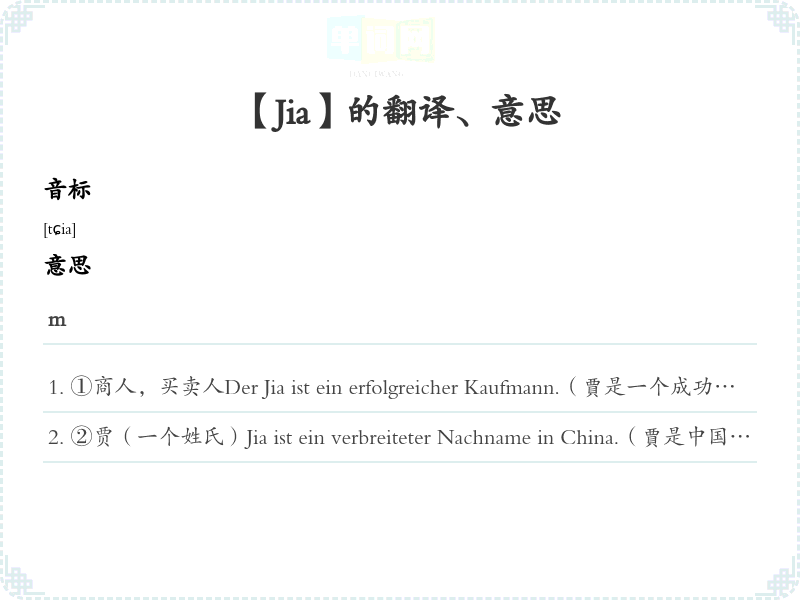 ②贾(一个姓氏)Jia ist ein verbreiteter Nachname in China.(賈是中国常见的姓。)