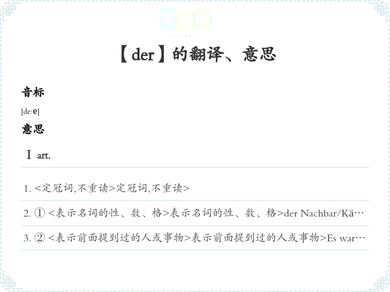 ② <代替人称代词er,sie,es>他;她;它;他们代替人称代词er,sie,es>Wo ist Klaus? Der ist in der Sitzung. Klaus哪儿?他。Ⅲ pron.<关系代词>关系代词>die Dame, der ich begegnete 我碰到的那位女士