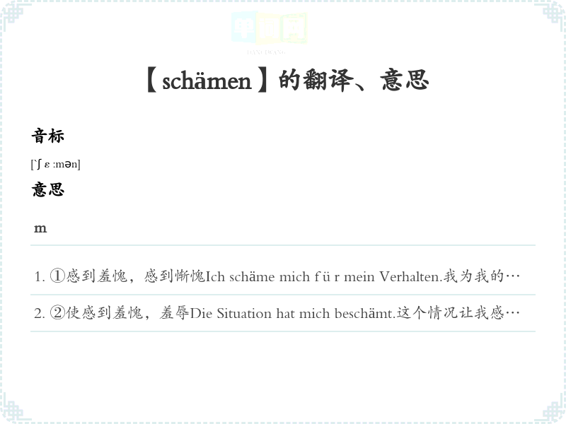 ①感到羞愧,感到惭愧Ich schäme mich für mein Verhalten.我为我的行为感到羞愧。