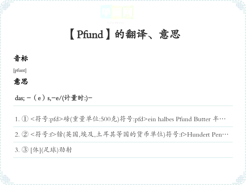 ① <符号:pfd>磅(重量单位:500克)符号:pfd>ein halbes Pfund Butter 半磅黄油der Preis eines Pfundes Fleisch 一磅肉的价格