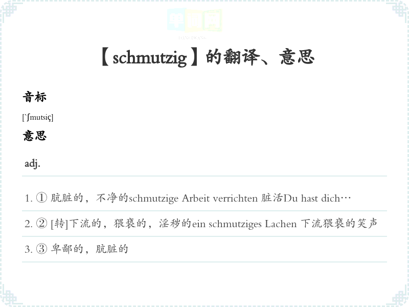 ① 肮脏的,不净的schmutzige Arbeit verrichten 脏活Du hast dich schmutzig gemacht. 己弄脏了。Man soll seine schmutzige Wäsche nicht vor anderen waschen. [谚]不要脏衣服当着人的来洗。(意指:家丑不可扬)