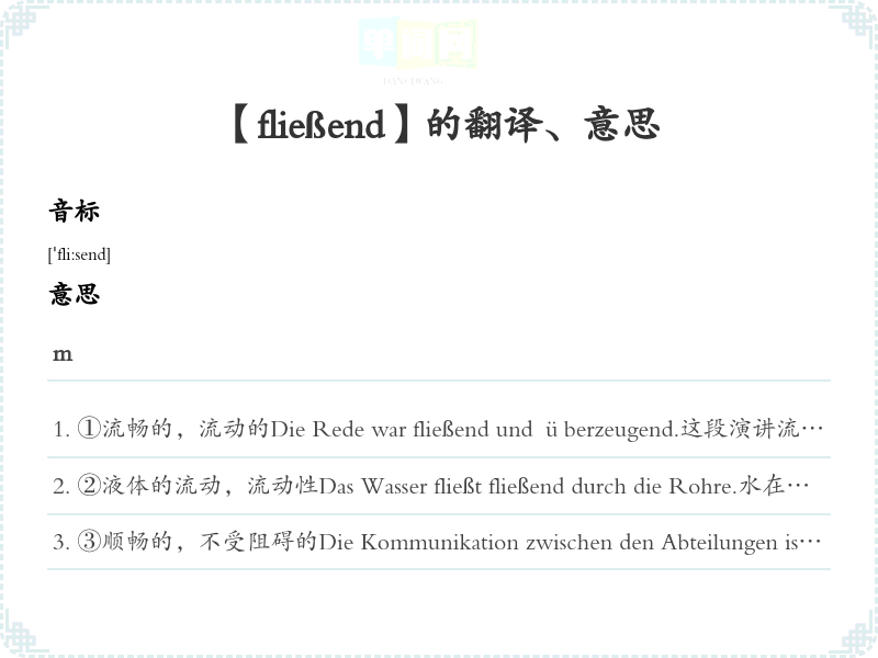 ①流畅的,流动的Die Rede war fließend und überzeugend.这段演讲流畅而有说服力。