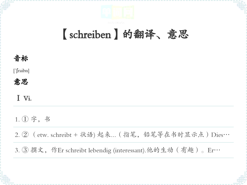 ③ 撰文,作Er schreibt lebendig (interessant).他的生动(有趣)。Er schreibt in einer Sprache, die jeder versteht.他用一通俗易懂的语言作。Er schreibt schon seit Jahren an seiner Doktorarbeit.几年来他一直在他的博士论文。