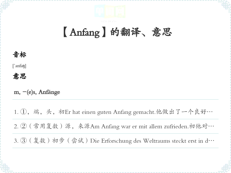 ①,端,头,初Er hat einen guten Anfang gemacht.他做出了一个良好的端。Aller Anfang ist schwer.万事头难。