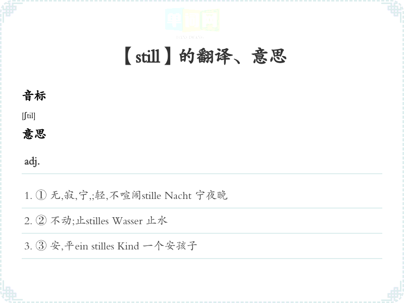 ① 无,寂,宁,;轻,不喧闹stille Nacht 宁夜晚