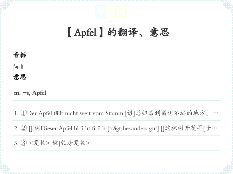 ①Der Apfel fällt nicht weit vom Stamm.[谚]总归落到离树不远的地方。(意指:有其父必有其子;多用于贬)