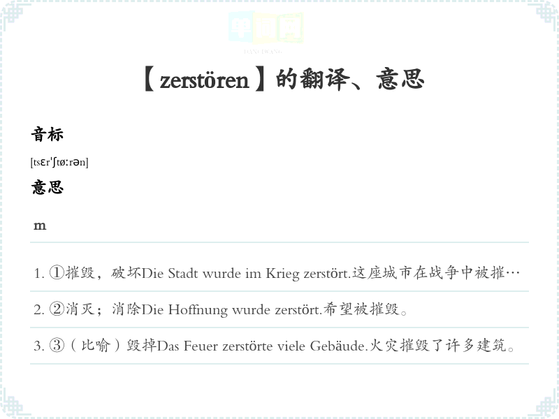 ①摧毁,破坏Die Stadt wurde im Krieg zerstört.这座城市在战争中被摧毁。