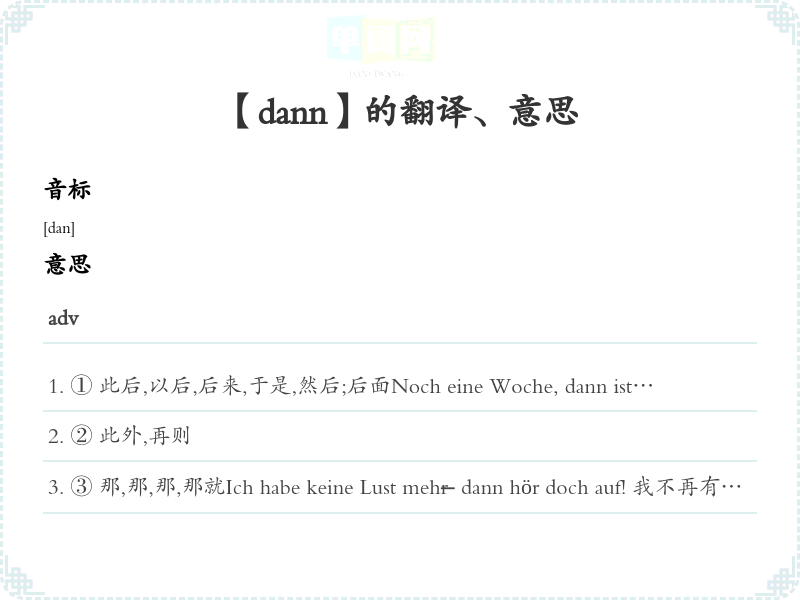 ① 此后,以后,后来,于是,然后;后面Noch eine Woche, dann ist Weihnachten.还有一个星期,之后就是圣诞节了。