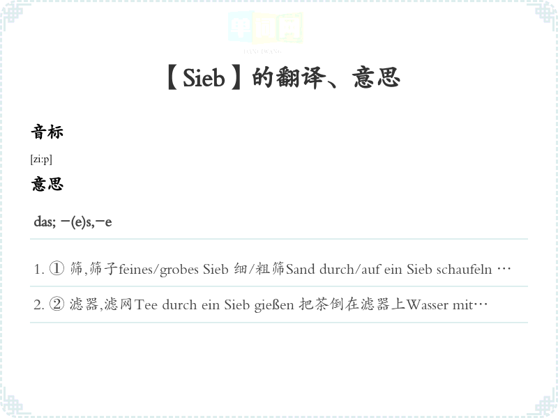 ② 滤器,滤网Tee durch ein Sieb gießen 把茶倒在滤器上Wasser mit einem/in den Sieb schöpfen 竹篮打水一场空