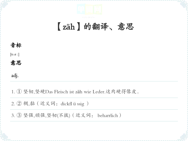 ① 坚韧,坚硬Das Fleisch ist zäh wie Leder.这肉硬得像皮。