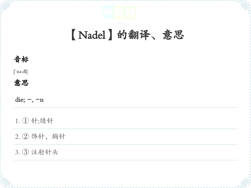 ④ (盘、速度计等仪表上的)指针Die Nadel des Kompasses zeigt nach Norden.盘的指针指向北。