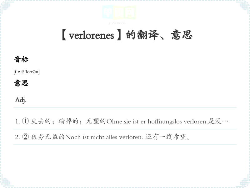 ① 失去的;输掉的;无望的Ohne sie ist er hoffnungslos verloren.是没有她,蛋了。