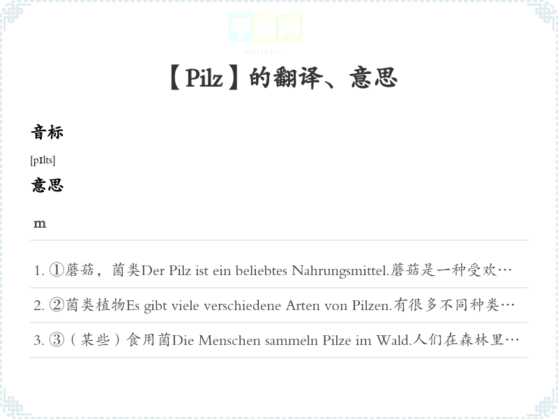 ①蘑菇,菌类Der Pilz ist ein beliebtes Nahrungsmittel.蘑菇是一种受欢迎的食物。