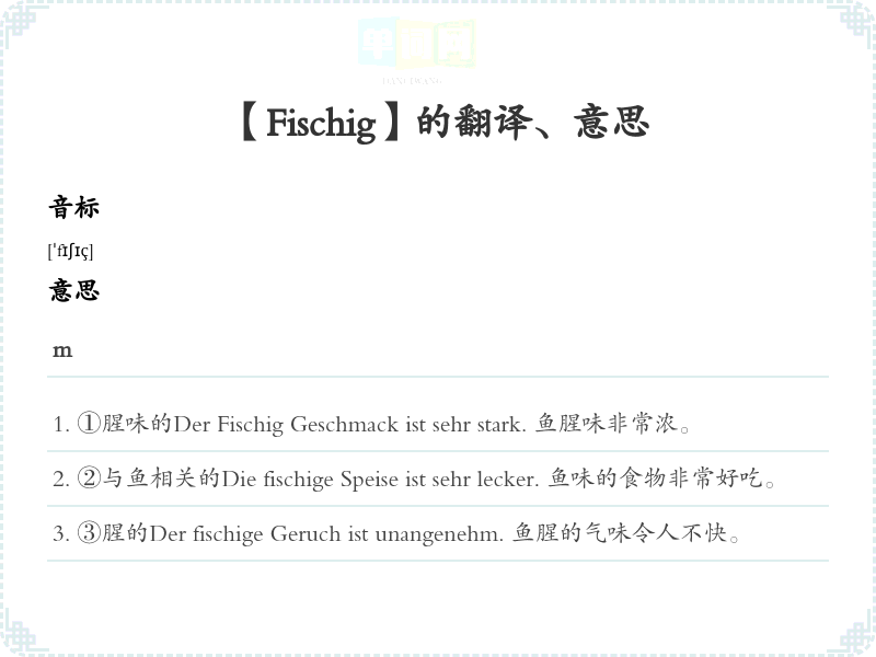 ②与鱼相关的Die fischige Speise ist sehr lecker. 鱼味的食物非常好吃。