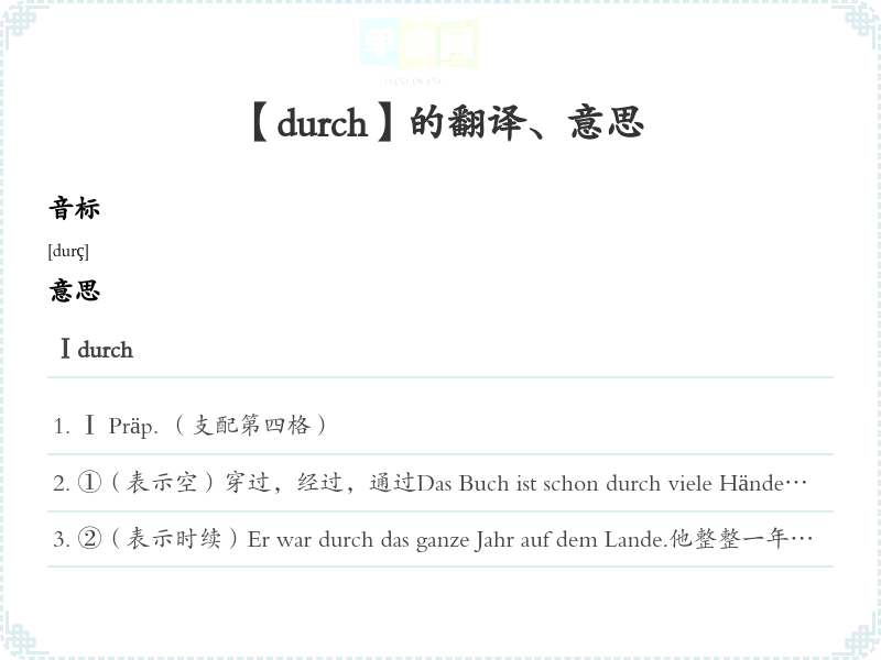 ①(表示空)穿过,经过,通过Das Buch ist schon durch viele Hände gegangen.这本书已经几易其主了。Der Schuss ging ihm durchs Herz.子弹穿过他心脏。
