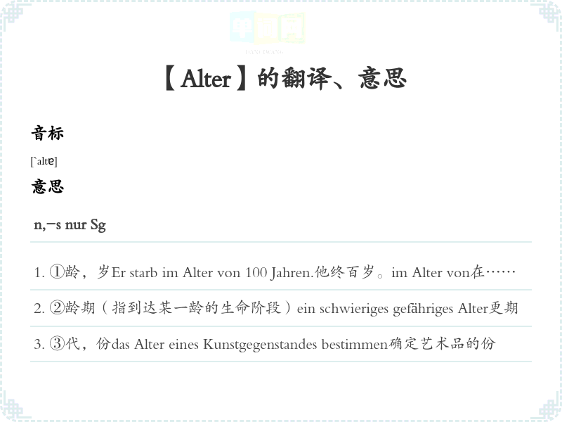 ⑥(集合名词)老人↔Jugendein biblisches Alter高寿ein Mann in beste Alter精壮Alter schützt vor Torheit nicht.人老非圣贤,孰能无过。 www.godic.net 版 权 所 有