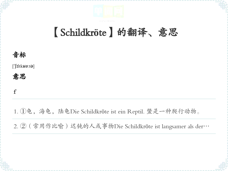 ②(常用作比喻)迟钝的人或事物Die Schildkröte ist langsamer als der Hase. 龟比兔子慢。