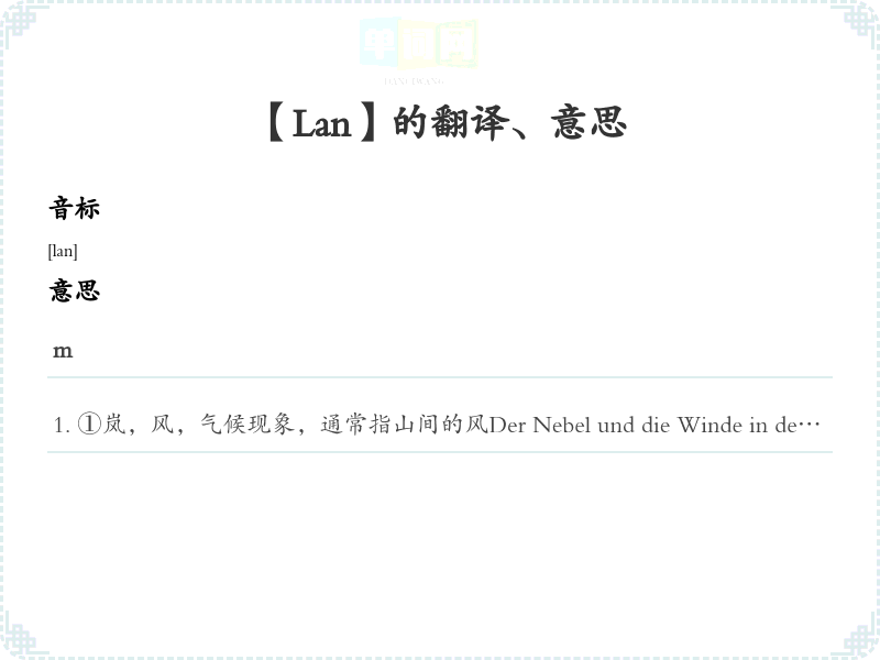 ①岚,风,气候现象,通常指山间的风Der Nebel und die Winde in den Bergen schaffen eine mystische Atmosphäre.雾和山间的风营造出一种神秘的氛围。