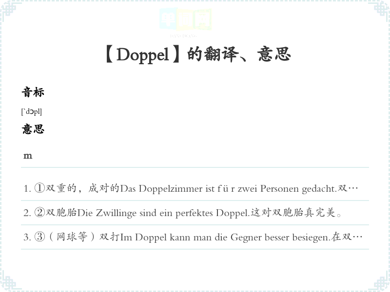 ④一对,成对物品Ich habe ein Doppel von diesem Buch.我有这本书的一对。
