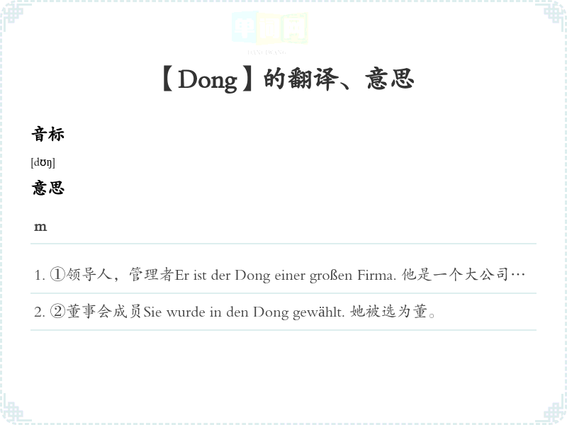 ①领导人,管理者Er ist der Dong einer großen Firma. 他是一个大公司的董。