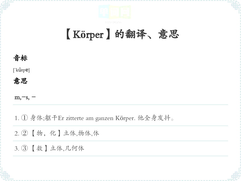 ① 身体;躯干Er zitterte am ganzen Körper. 他全身发抖。