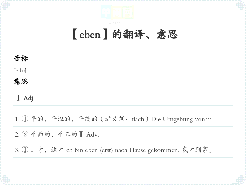 ① 平的,平坦的,平缓的(近义词:flach)Die Umgebung von Hannover ist ziemlich eben.汉诺威的郊区十平坦。