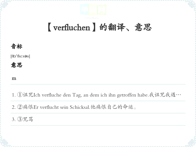①诅咒Ich verfluche den Tag, an dem ich ihn getroffen habe.我诅咒我遇见他的那一天。