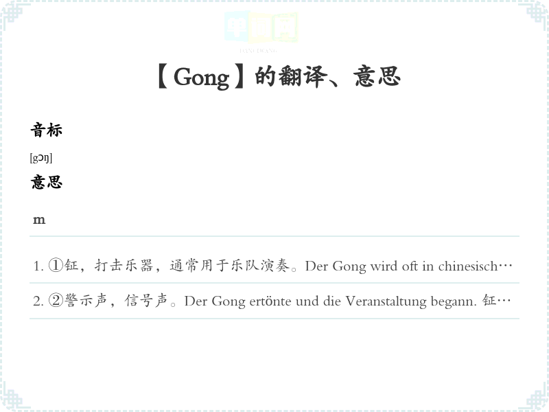 ①钲,打击乐器,通常用于乐队演奏。Der Gong wird oft in chinesischen Zeremonien verwendet. 钲通常用于中国的仪式中。