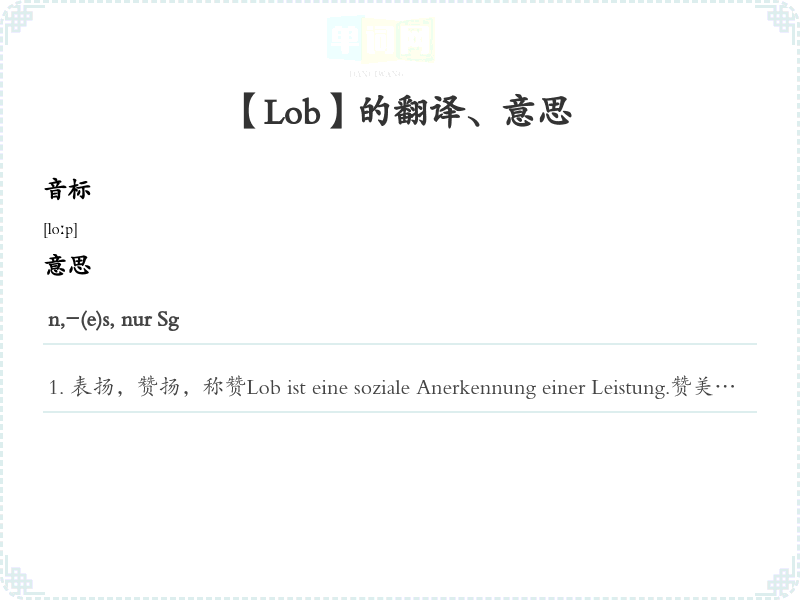 表扬,赞扬,称赞Lob ist eine soziale Anerkennung einer Leistung.赞美是对所得成就社。Lob und Kritik褒贬 Fr helper cop yright