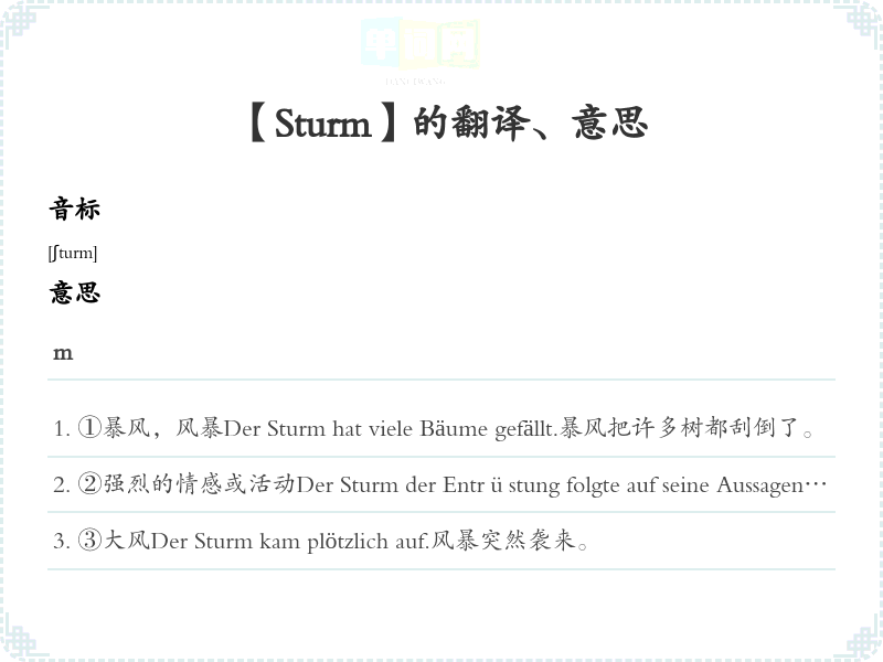 ①暴风,风暴Der Sturm hat viele Bäume gefällt.暴风把许多树都刮倒了。