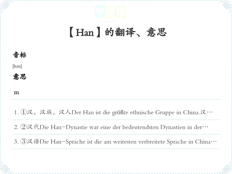 ①汉,汉族,汉人Der Han ist die größte ethnische Gruppe in China.汉是中国最大的民族。