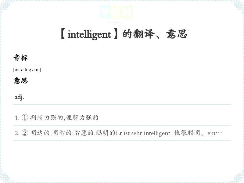 ② 明达的,明智的;智慧的,聪明的Er ist sehr intelligent. 他很聪明。ein intelligenter Mensch 一个聪明的人