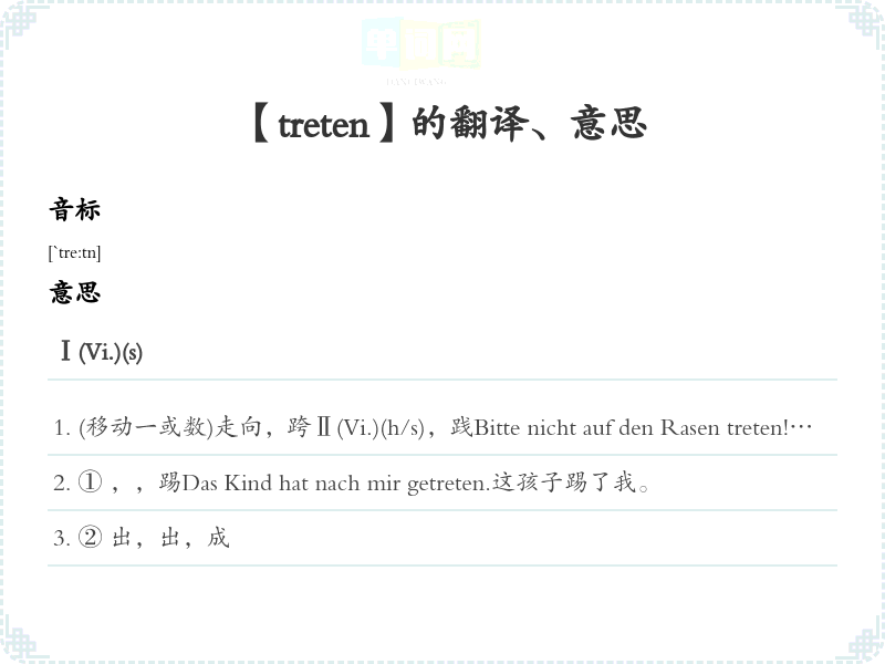 ,践Bitte nicht auf den Rasen treten!请勿践草地!Du hast mir auf den Fuß getreten.你着我的脚了。Ⅲ Vt.