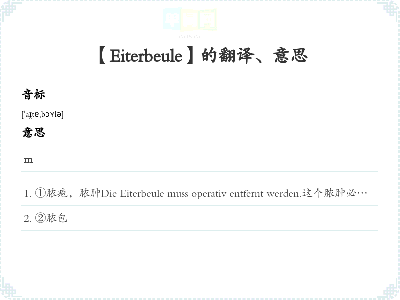 ①脓疱,脓肿Die Eiterbeule muss operativ entfernt werden.这个脓肿必须通过手术切除。
