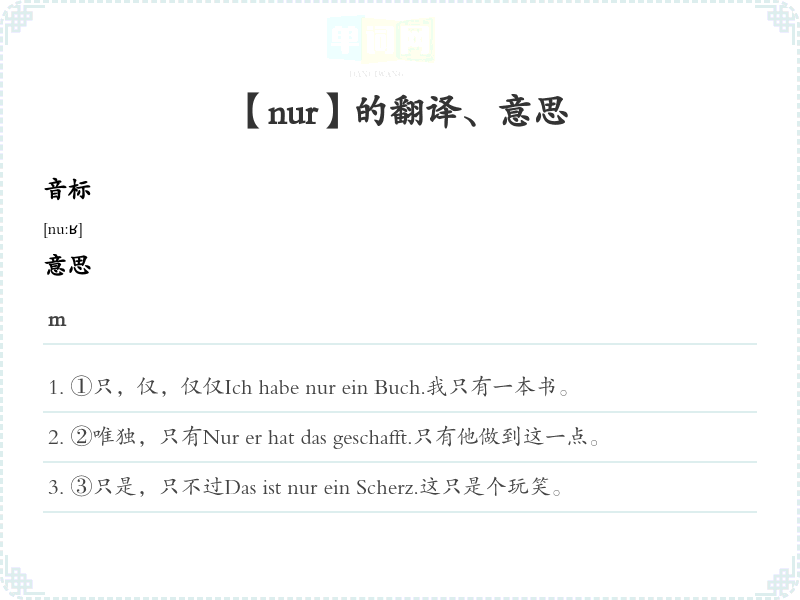 ①只,仅,仅仅Ich habe nur ein Buch.我只有一本书。