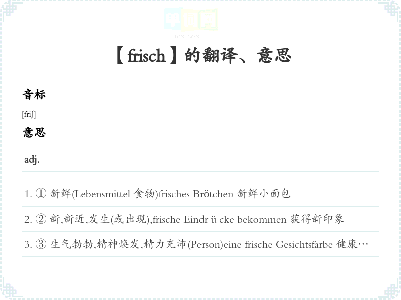 ③ 生气勃勃,精神焕发,精力充沛(Person)eine frische Gesichtsfarbe 健康面色Wollen Sie sich frisch machen? 您要洗一洗吗?(指洗脸、洗澡等)