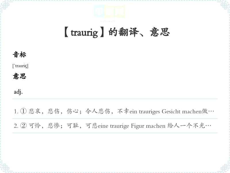 ① 悲哀,悲伤,伤心;令人悲伤,不幸ein trauriges Gesicht machen做出一副难过样子Bist du traurig darüber, dass wir ihn nicht wieder sehen werden? 你是不是因为没见到他感到难过?Es ist traurig, dass du das nicht einsiehst.你没看出这点真遗憾!Das Traurige daran ist, dass ... 令人痛惜是...