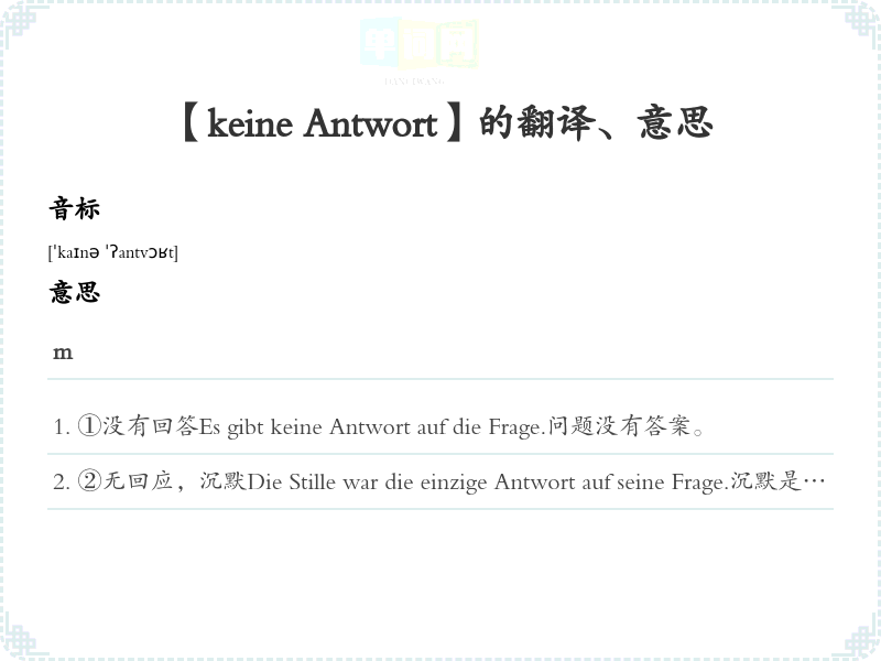 ①没有回答Es gibt keine Antwort auf die Frage.问题没有答案。