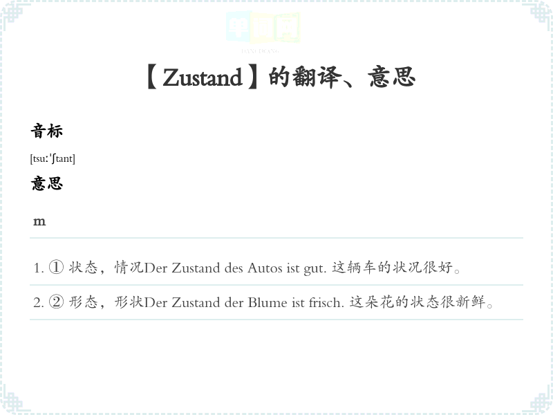① 状态,情况Der Zustand des Autos ist gut. 这辆车的状况很好。
