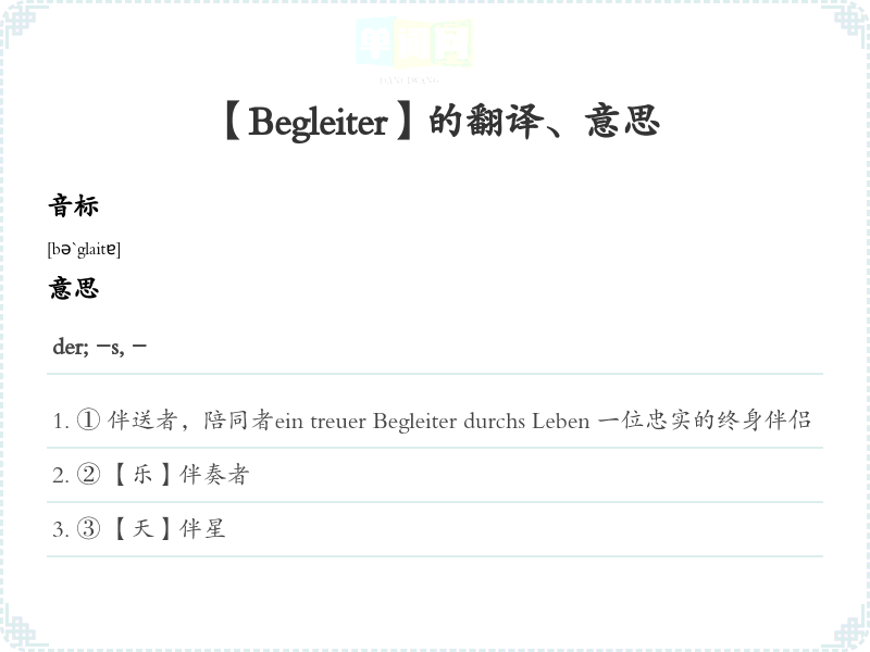 ① 伴送者,陪同者ein treuer Begleiter durchs Leben 一位忠实的终身伴侣