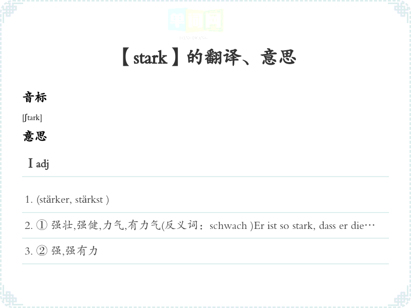① 强壮,强健,力气,有力气(反义词:schwach )Er ist so stark, dass er die schwere Kiste allein tragen kann .他很有力,那么沉重箱子都搬得起来。