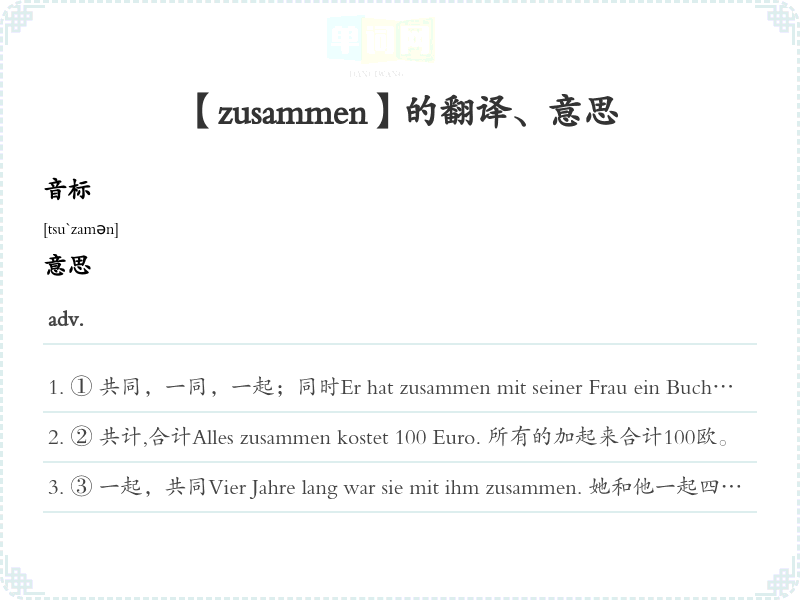 ① 共同,一同,一起;同时Er hat zusammen mit seiner Frau ein Buch geschrieben. 他和他妻子合写了一本书。