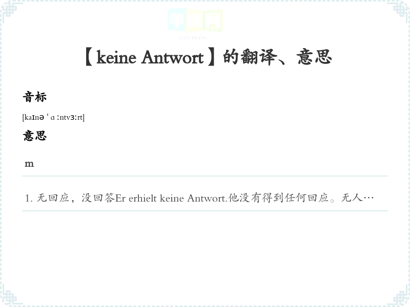 无回应,没回答Er erhielt keine Antwort.他没有得到任何回应。无人作答Die Frage blieb ohne Antwort.这个问题无人作答。
