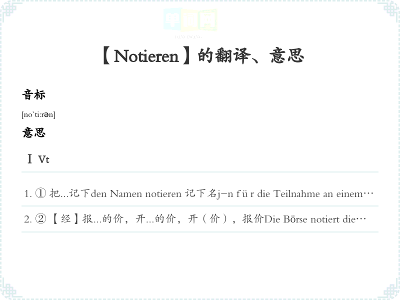 ② 【经】报...的价,开...的价,开(价),报价Die Börse notiert die Kurse. 交易所开出牌价。Ⅱ Vi【经】报价,开价Die Baumwolle notiert unverändert. 棉花行情不变。语法搭配sich+四格, sich+三格, +四格, zu+三格, bei+三格
